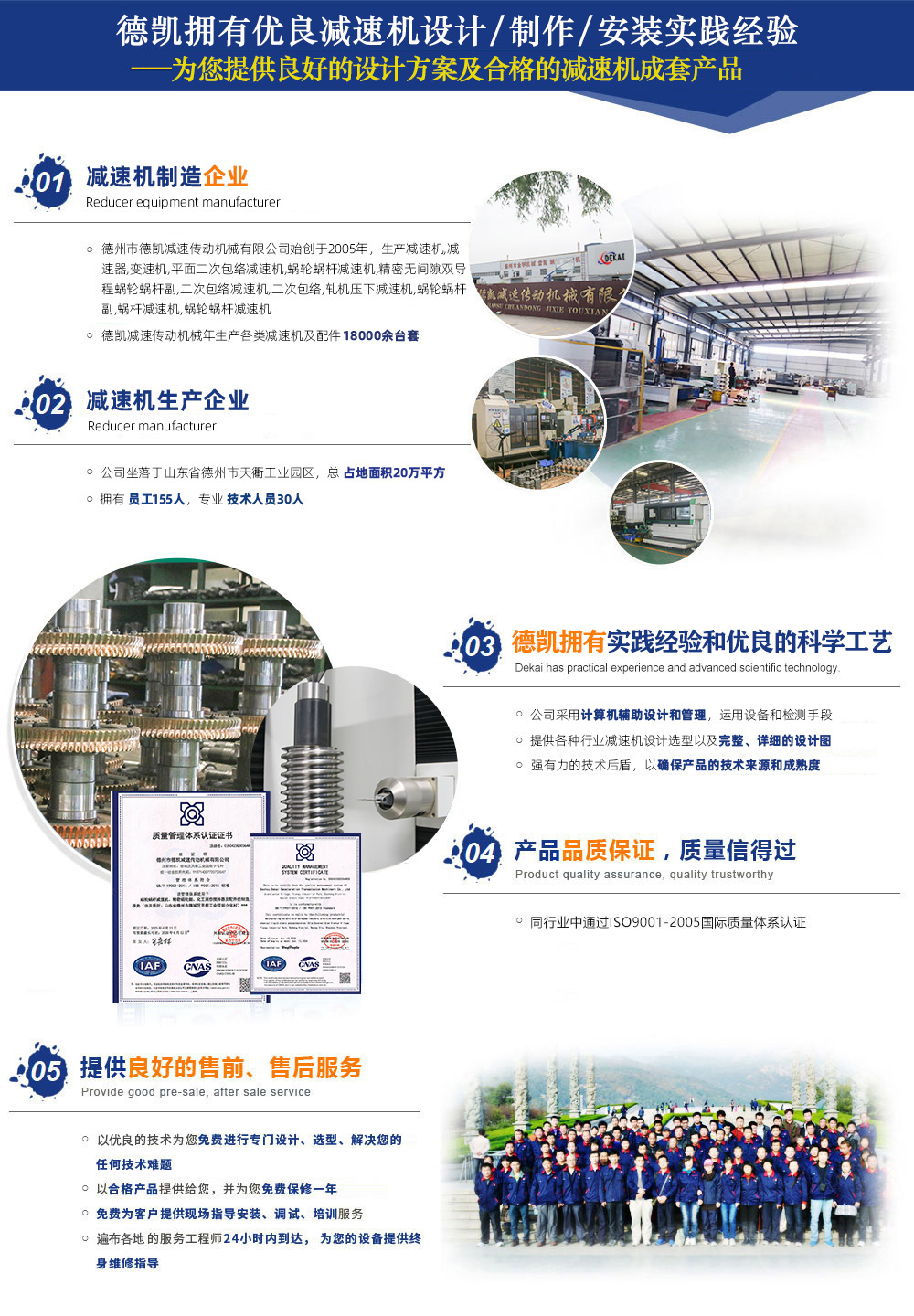 德州市德凱減速傳動(dòng)機(jī)械有限公司,生產(chǎn)減速機(jī),減速器,變速機(jī),平面二次包絡(luò)減速機(jī),蝸輪蝸桿減速機(jī),精密無間隙雙導(dǎo)程蝸輪蝸桿副,二次包絡(luò)減速機(jī),蝸輪蝸桿,軋機(jī)壓下減速機(jī),蝸輪蝸桿副,蝸桿減速機(jī),蝸輪蝸桿減速機(jī),公司占地面積20萬平方,員工155人,技術(shù)人員30人,年生產(chǎn)各類減速機(jī)及配件18000余臺(tái)套。在同行業(yè)中通過了ISO9001質(zhì)量管理體系認(rèn)證。公司設(shè)備齊全、技術(shù)力量強(qiáng)大、檢測(cè)手段完善,引進(jìn)國(guó)外大型數(shù)控二次包絡(luò)機(jī)床GJK75加工數(shù)控4臺(tái),可加工到800二次包絡(luò)蝸輪蝸桿。引進(jìn)漢江S7732蝸桿磨床3臺(tái),精度可達(dá)5級(jí)。公司擁有輝光離子氮化爐4臺(tái),經(jīng)該設(shè)備氮化后可提高蝸桿表面硬度、耐磨性高、提高疲勞強(qiáng)度、變形量小、耐蝕性、...